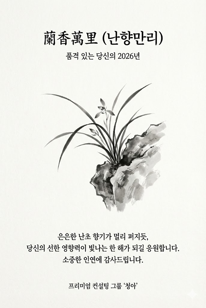 Message Body: In the lower center, include a heartfelt 2-4 line message: ["은은한 난초 향기가 멀리 퍼지듯, 당신의 선한 영향력이 빛나는 한 해가 되길 응원합니다. 소중한 인연에 감사드립니다."].