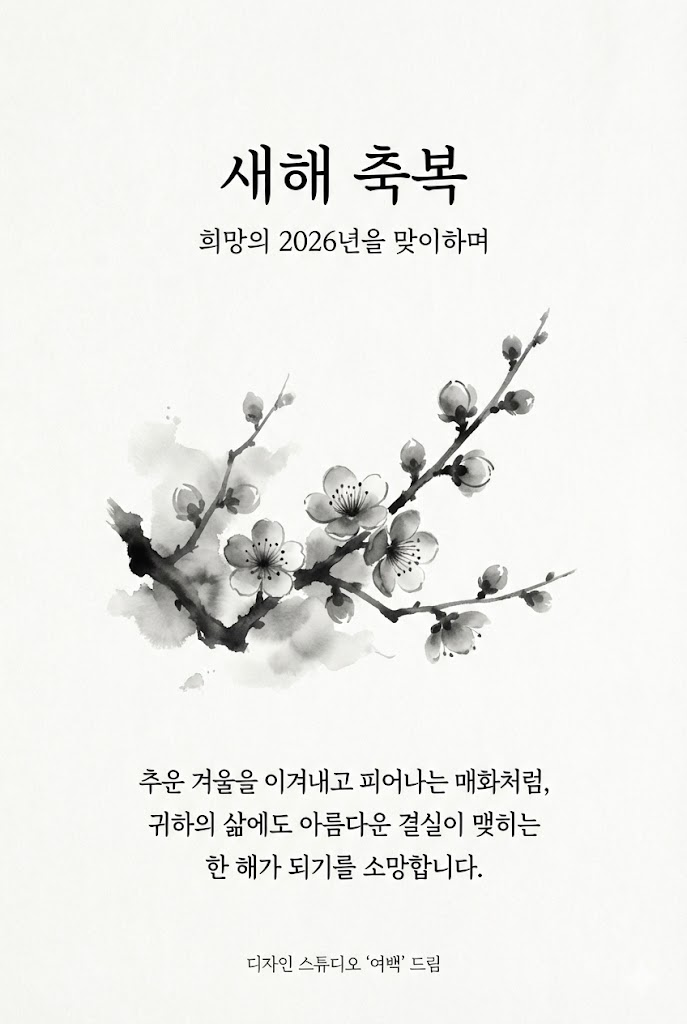 Message Body: In the lower center, include a heartfelt 2-4 line message: "[추운 겨울을 이겨내고 피어나는 매화처럼, 귀하의 삶에도 아름다운 결실이 맺히는 한 해가 되기를 소망합니다.]".
