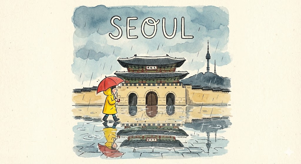 A charming, hand-drawn illustration in the whimsical style of a children's storybook, rendered with watercolor and ink textures. The image shows a scene from Seoul. At the top, the city name " Seoul " is written in a playful, hand-drawn font. Below it, a specific scene unfolds: A person in a yellow raincoat holding a red umbrella, walking past the Gwanghwamun Gate. Reflections of the gate and the person are visible on the wet ground. Namsan Tower is silhouetted in the background. The art style features visible brushstrokes, a limited color palette of muted blues, yellows, reds, and earthy tones, and a naive, heartwarming aesthetic with simple lines and character designs, reminiscent of traditional travel posters or book plates. The background is a flat or subtly textured color block.