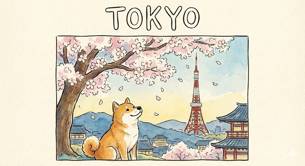 A charming, hand-drawn illustration in the whimsical style of a children's storybook, rendered with watercolor and ink textures. The image shows a scene from Tokyo. At the top, the city name " Tokyo " is written in a playful, hand-drawn font. Below it, a specific scene unfolds: A Shiba Inu dog sitting calmly under a blooming cherry blossom tree, looking up at the Tokyo Tower in the distance. A few petals are falling around them. The art style features visible brushstrokes, a limited color palette of muted blues, yellows, reds, and earthy tones, and a naive, heartwarming aesthetic with simple lines and character designs, reminiscent of traditional travel posters or book plates. The background is a flat or subtly textured color block.