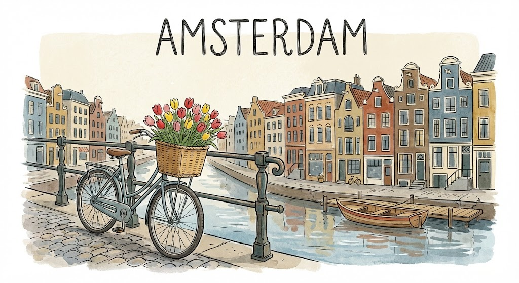 A charming, hand-drawn illustration in the whimsical style of a children's storybook, rendered with watercolor and ink textures. The image shows a scene from Amsterdam. At the top, the city name " Amsterdam " is written in a playful, hand-drawn font. Below it, a specific scene unfolds: A bicycle leaning against a bridge railing over a canal, with a basket full of tulips. Narrow canal houses with traditional facades line the waterway, and a small boat is tied to the dock. The art style features visible brushstrokes, a limited color palette of muted blues, yellows, reds, and earthy tones, and a naive, heartwarming aesthetic with simple lines and character designs, reminiscent of traditional travel posters or book plates. The background is a flat or subtly textured color block.