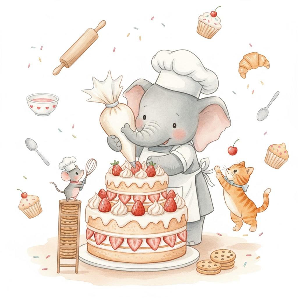 - A charming watercolor illustration of a [gentle elephant] dressed as a [pastry chef] decorating [a giant strawberry cake] with a [tiny mouse] and a [playful cat]. The background features a minimalist, light, and airy watercolor style with plenty of white space, showing only [floating kitchen utensils and sweet treats].