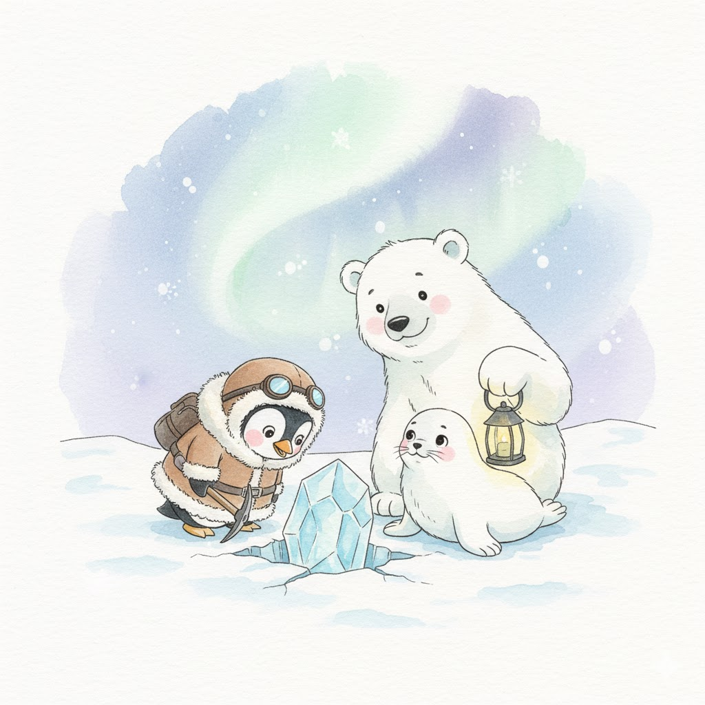 - A charming watercolor illustration of a [curious penguin] dressed as an [arctic explorer] discovering [a hidden ice crystal] with a [fluffy seal] and a [friendly polar bear]. The background features a minimalist, light, and airy watercolor style with plenty of white space, showing [subtle snowflakes and a faint aurora].