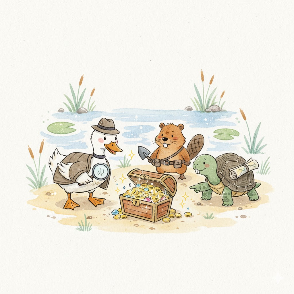 A charming watercolor illustration of a [호기심 많은 오리] dressed as a [보물 사냥꾼] searching for [빛나는 황금 동전 상자] with a [영리한 비버] and a [느긋한 거북이]. The background features a minimalist, light, and airy watercolor style with plenty of white space, showing only [반짝이는 강가와 몇몇 수초].