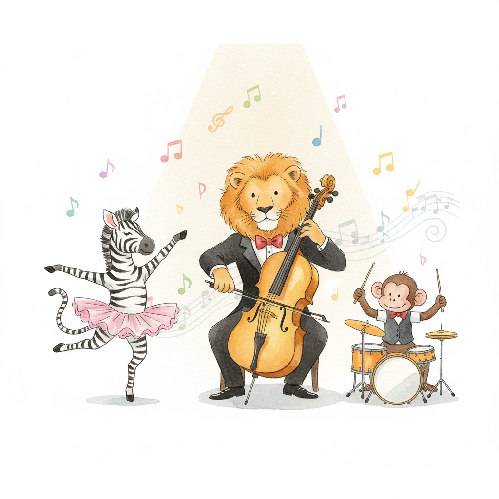 - A charming watercolor illustration of a [majestic lion] dressed as a [classical musician] playing [a golden cello] with a [percussionist monkey] and a [dancing zebra]. The background features a minimalist, light, and airy watercolor style with plenty of white space, showing [whimsical musical notes and a soft spotlight].