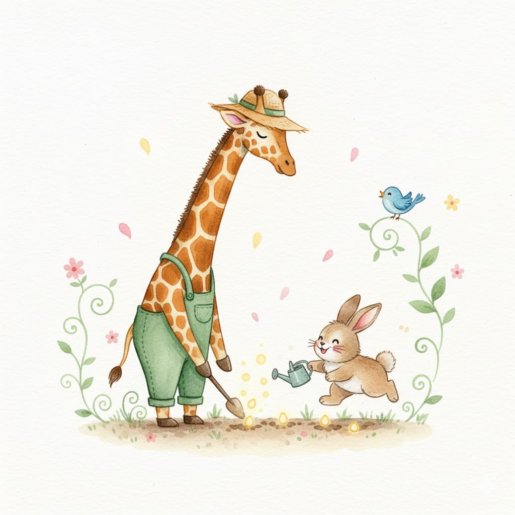 - A charming watercolor illustration of a [tall giraffe] dressed as a [gardener] planting [magical glowing seeds] with a [bouncing bunny] and a [chirping bluebird]. The background features a minimalist, light, and airy watercolor style with plenty of white space, showing [delicate vines and floating flower petals].