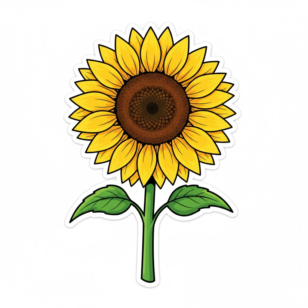 "A pop-art style sticker illustration of [a blooming sunflower] with a thick white outline, featuring bold lines and vibrant colors, on a white background."