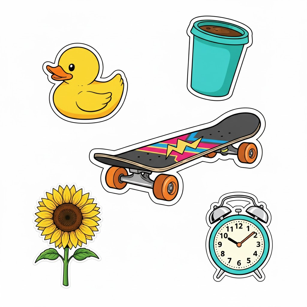 "A pop-art style sticker illustration of [object] with a thick white outline, featuring bold lines and vibrant colors, on a white background."