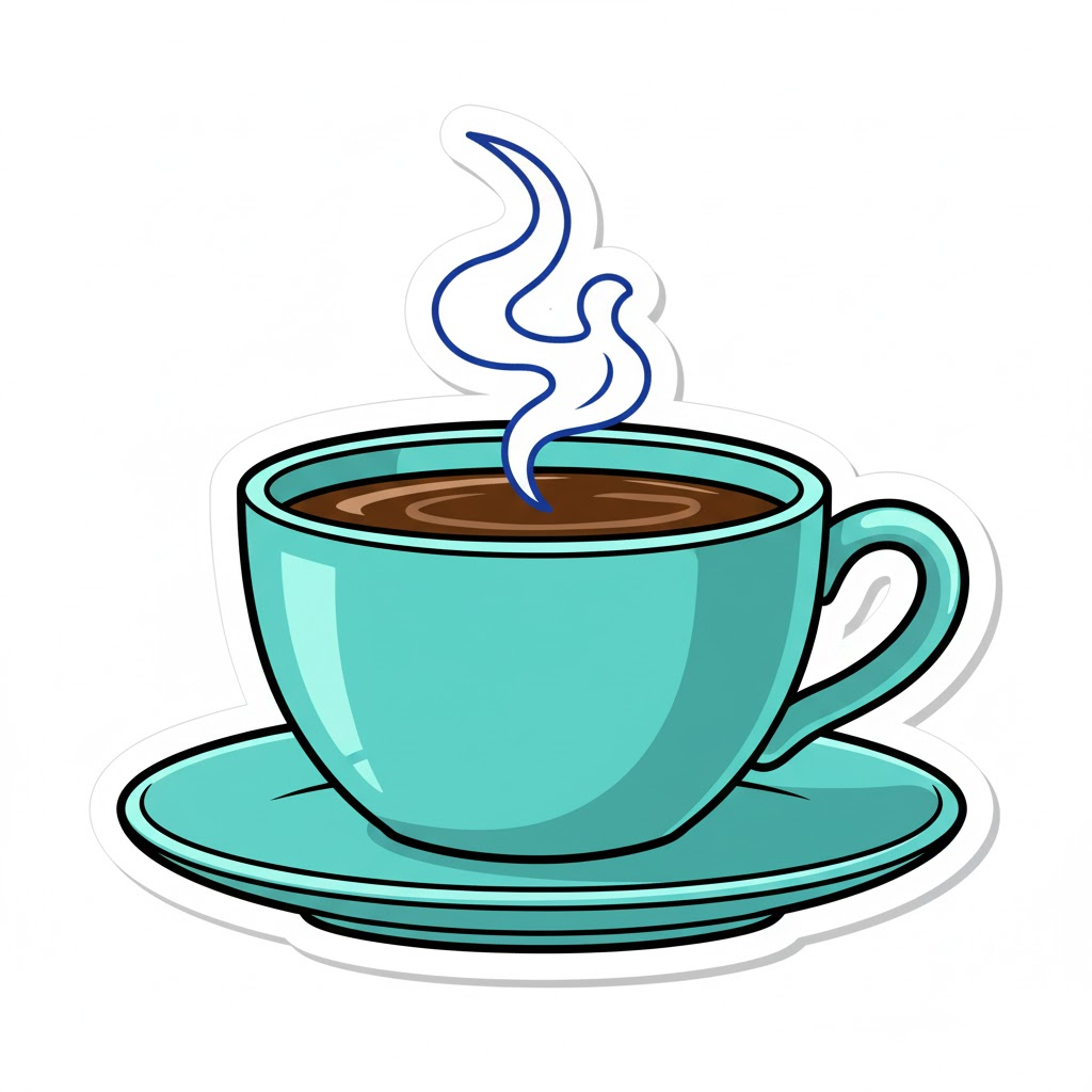 "A pop-art style sticker illustration of [a steaming coffee cup] with a thick white outline, featuring bold lines and vibrant colors, on a white background."