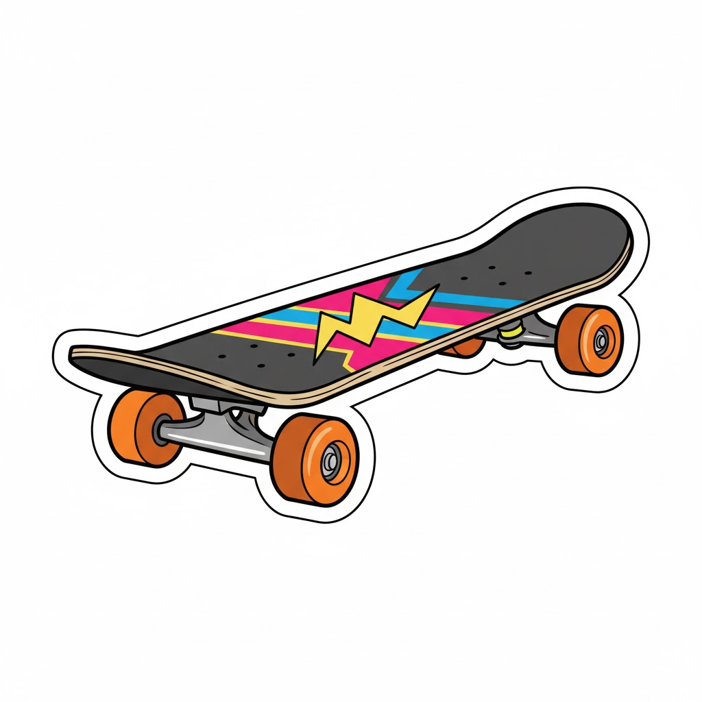 "A pop-art style sticker illustration of [a classic skateboard] with a thick white outline, featuring bold lines and vibrant colors, on a white background."