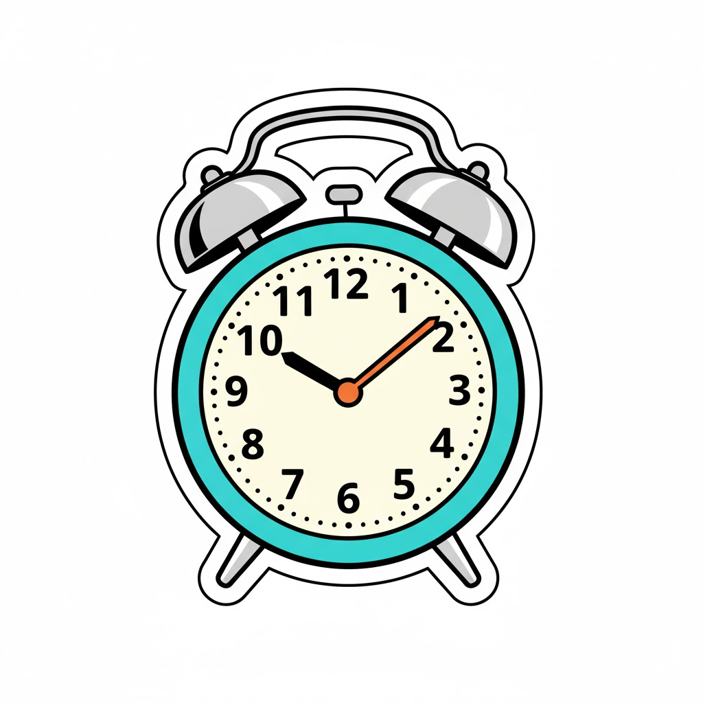 "A pop-art style sticker illustration of [a retro alarm clock] with a thick white outline, featuring bold lines and vibrant colors, on a white background."