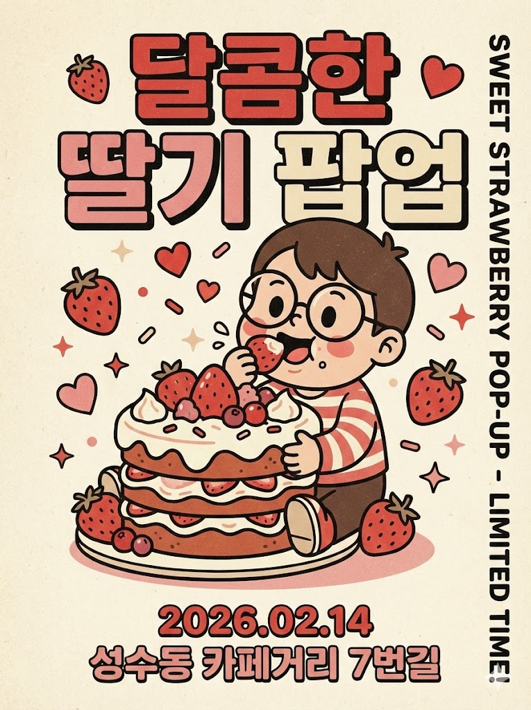 A graphic design poster in a flat, whimsical retro illustration style with bold outlines and a grainy vintage paper texture. The central illustration features a cute character with big glasses happily eating a giant strawberry cake against a solid Vibrant Pink background. The poster includes stylized typography with a large bold title "달콤한 딸기 팝업", event details including date and time "2026.02.14", and location info "성수동 카페거리 7번길". The composition is dynamic and artistic, with small decorative elements like floating strawberries, hearts, or sprinkles scattered around. Vertical text is placed on the right side for an authentic poster look. --ar 3:4