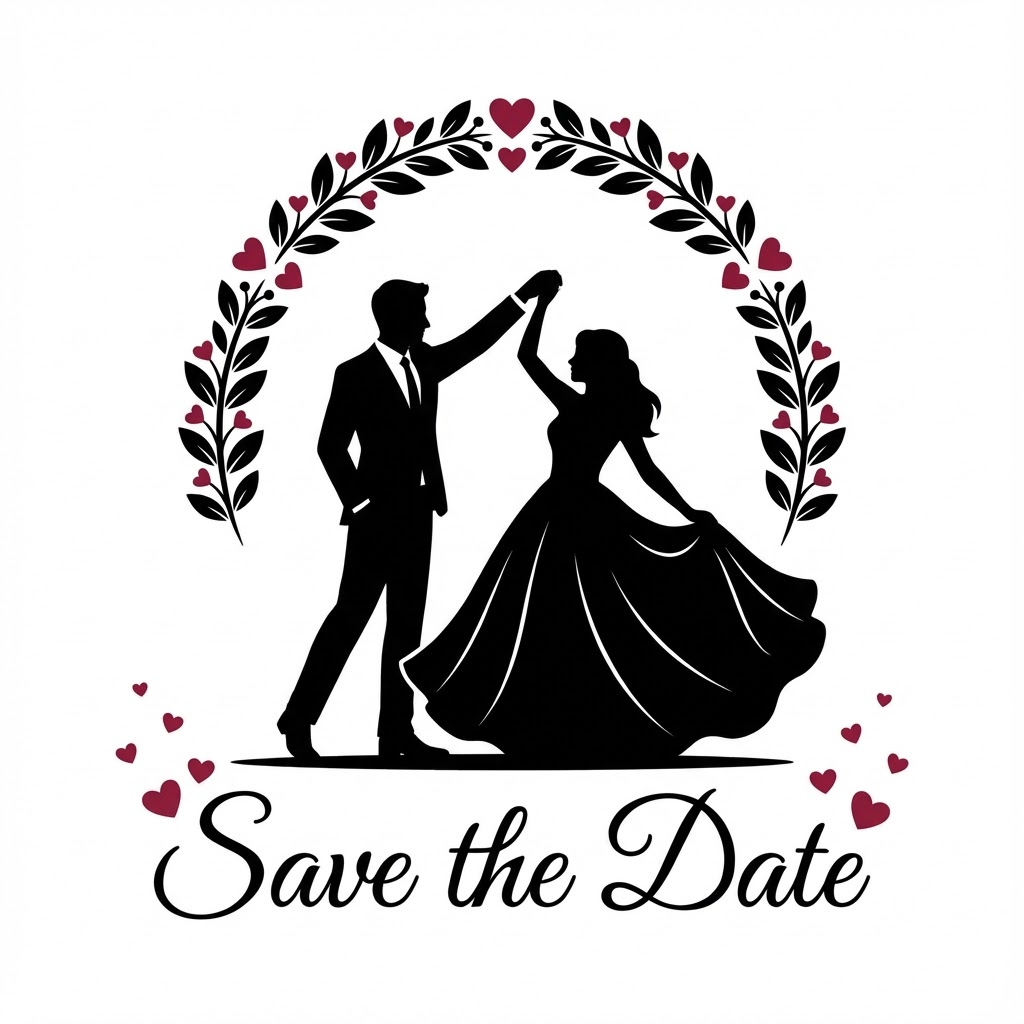 A flat vector illustration in the style of a black silhouette cutout against a solid white background. A romantic couple is shown dancing joyfully, dressed in wedding attire (suit and gown). The scene is decorated with an archway of leaves and hearts above them, and the elegant script text "Save the Date" below them. The color palette is strictly limited to solid black for the figures and primary elements, with deep red accents used only for hearts or specific decorative details. Clean lines, minimalist and elegant design. --ar 1:1