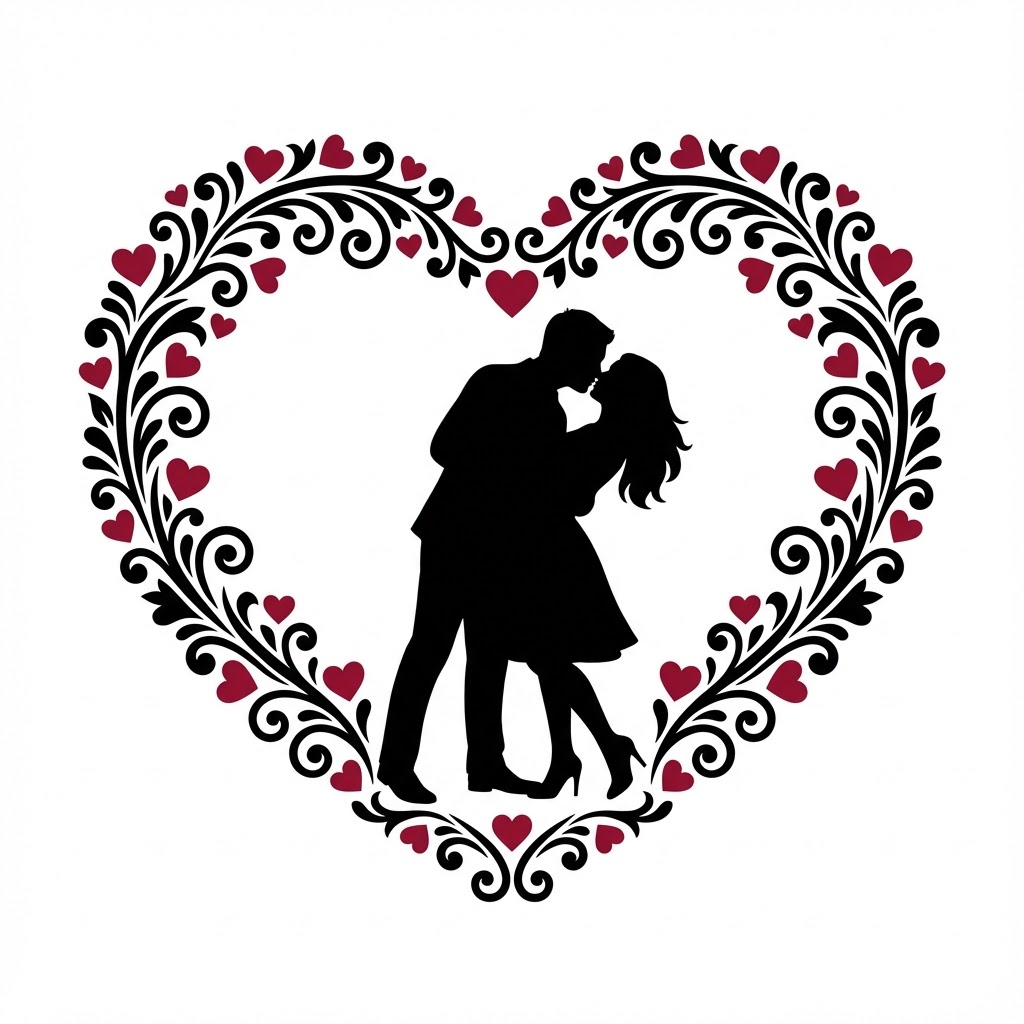 A flat vector illustration in the style of a black silhouette cutout against a solid white background. A romantic couple is shown sharing a gentle kiss while the man dips the woman slightly. The scene is decorated with an ornate heart-shaped frame made of swirling floral patterns and small red hearts. The color palette is strictly limited to solid black for the figures and primary elements, with deep red accents used only for hearts or specific decorative details. Clean lines, minimalist and elegant design. --ar 1:1