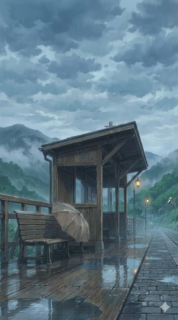 A high-quality anime art style illustration in the aesthetic of Studio Ghibli and Makoto Shinkai. The scene features a small, rustic train station platform where a single umbrella is leaning against a wooden bench, with mist-covered mountains in the background. The atmosphere is melancholic yet cozy, with soft, muted colors and cool blue-gray tones. The sky is overcast with heavy, textured clouds, and gentle raindrops are falling through the air. Puddles on the ground create beautiful, shimmering reflections of the surroundings. Wet surfaces, lush rain-soaked greenery, and misty mountains in the distance are meticulously rendered. Cinematic lighting, 8k resolution, nostalgic mood, --ar 9:16