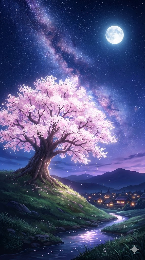 A high-quality anime art style illustration in the aesthetic of Studio Ghibli and Makoto Shinkai. The scene features a single, ancient cherry blossom tree on a grassy hill, with its petals glowing softly under a sky filled with the Milky Way. The atmosphere is mystical and serene, with deep indigo, violet, and navy tones. The night sky is vast and clear, filled with thousands of twinkling stars, the Milky Way, and a large, glowing moon. Soft, ethereal light from the moon and stars illuminates the scene, creating magical reflections and a dreamy glow. Every detail is meticulously rendered, from the silhouettes of trees to the glowing windows of buildings. Cinematic lighting, 8k resolution, calm mood, --ar 9:16