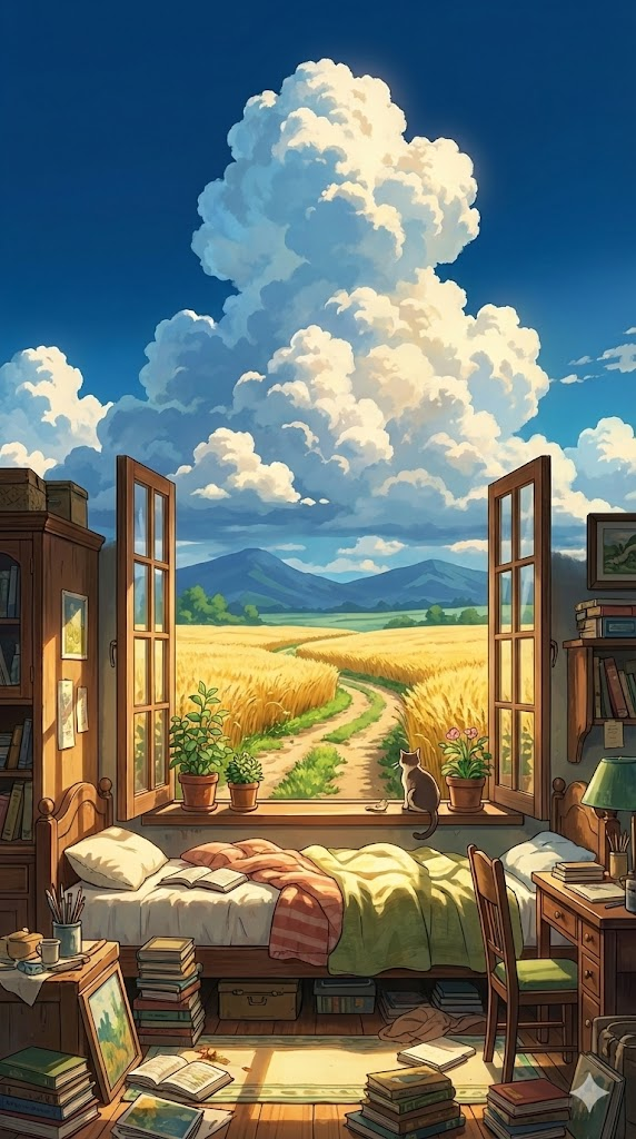A high-quality anime art style illustration in the aesthetic of Studio Ghibli and Makoto Shinkai. The scene features a messy but cozy bedroom view from an open window looking out onto a distant mountain range and a golden wheat field. The atmosphere is peaceful and nostalgic, with vibrant and saturated colors. The sky is a deep, brilliant blue filled with massive, fluffy, towering white and golden cumulus clouds. Warm, soft sunlight illuminates the scene, creating gentle shadows and a magical glow. Every detail is meticulously rendered, from the lush greenery and blooming flowers to the textured architecture. Cinematic lighting, 8k resolution, serene mood, --ar 9:16