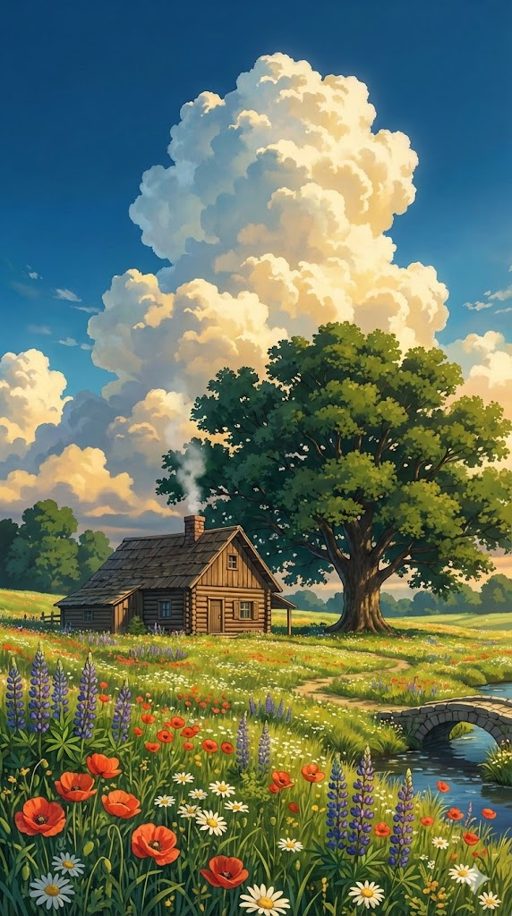 A high-quality anime art style illustration in the aesthetic of Studio Ghibli and Makoto Shinkai. The scene features a cozy wooden cabin nestled in a vast field of wildflowers under a giant oak tree. The atmosphere is peaceful and nostalgic, with vibrant and saturated colors. The sky is a deep, brilliant blue filled with massive, fluffy, towering white and golden cumulus clouds. Warm, soft sunlight illuminates the scene, creating gentle shadows and a magical glow. Every detail is meticulously rendered, from the lush greenery and blooming flowers to the textured architecture. Cinematic lighting, 8k resolution, serene mood, --ar 9:16