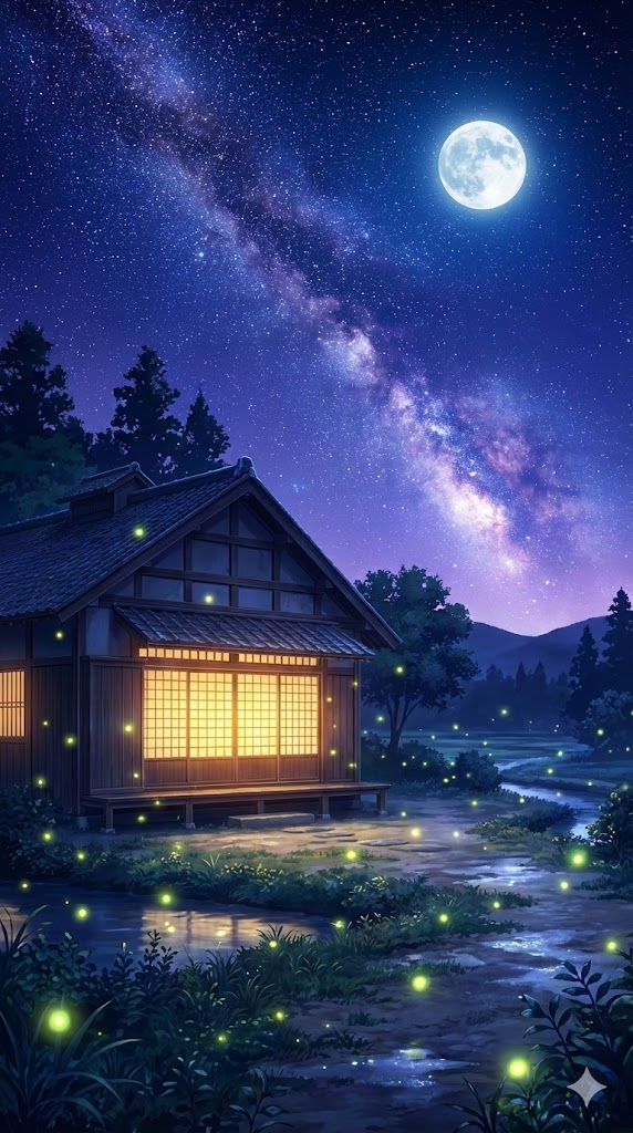 A high-quality anime art style illustration in the aesthetic of Studio Ghibli and Makoto Shinkai. The scene features a traditional Japanese countryside house with warm yellow light leaking from the shoji screens, surrounded by dozens of glowing fireflies. The atmosphere is mystical and serene, with deep indigo, violet, and navy tones. The night sky is vast and clear, filled with thousands of twinkling stars, the Milky Way, and a large, glowing moon. Soft, ethereal light from the moon and stars illuminates the scene, creating magical reflections and a dreamy glow. Every detail is meticulously rendered, from the silhouettes of trees to the glowing windows of buildings. Cinematic lighting, 8k resolution, calm mood, --ar 9:16