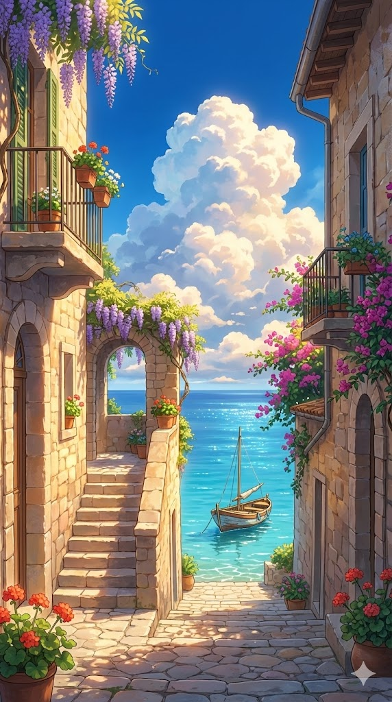 A high-quality anime art style illustration in the aesthetic of Studio Ghibli and Makoto Shinkai. The scene features a narrow, sun-drenched Mediterranean alleyway with stone steps leading down to a turquoise sea where a small boat is floating. The atmosphere is peaceful and nostalgic, with vibrant and saturated colors. The sky is a deep, brilliant blue filled with massive, fluffy, towering white and golden cumulus clouds. Warm, soft sunlight illuminates the scene, creating gentle shadows and a magical glow. Every detail is meticulously rendered, from the lush greenery and blooming flowers to the textured architecture. Cinematic lighting, 8k resolution, serene mood, --ar 9:16
