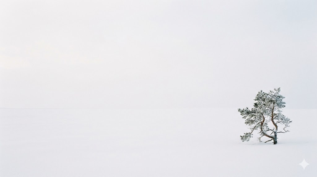 A minimalist composition featuring a single a small pine tree positioned in the bottom-right of the frame. The background is a vast, empty snow-white canvas, creating significant negative space. Soft, subtle lighting. Aspect Ratio: 16:9.
