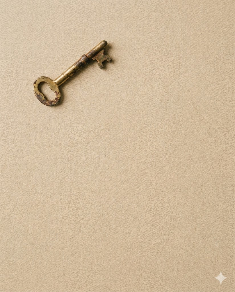 A minimalist composition featuring a single a rusted golden key positioned in the top-left of the frame. The background is a vast, empty warm beige canvas, creating significant negative space. Soft, subtle lighting. Aspect Ratio: 4:5.