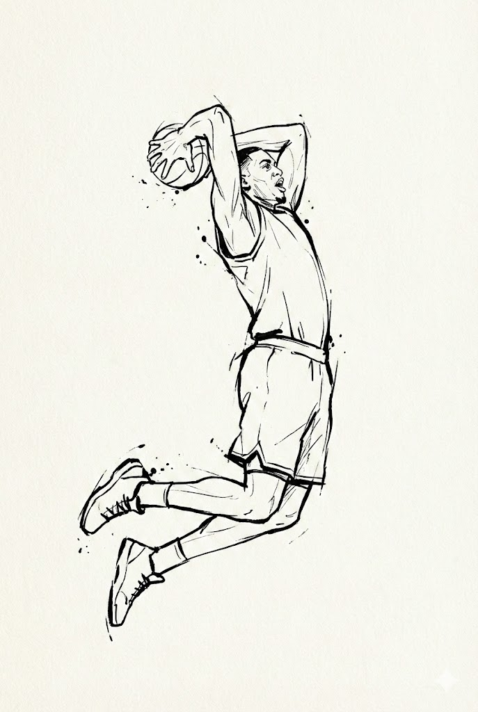 A minimalist ink gesture sketch in a modern editorial illustration style. A basketball player mid-air making a powerful slam dunk, body twisted with exertion is captured mid-motion. Rendered using loose, hand-drawn black ink lines with expressive line weight variation and imperfect strokes on a textured off-white paper canvas. Raw artistic energy, with negative space doing most of the storytelling. No background elements, just the essential form. --ar 2:3