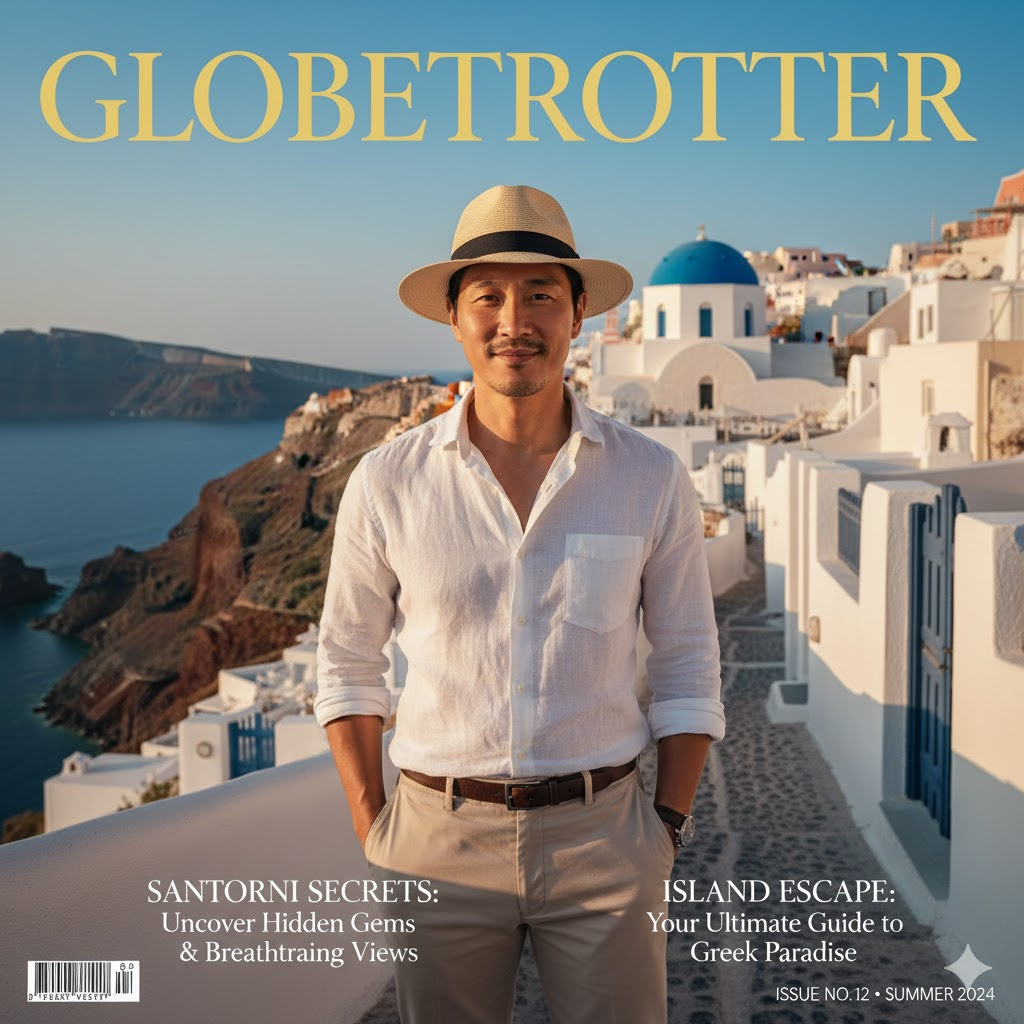 1. 산토리니의 청량함 (그리스) Design a high-end, vertical layout Travel Magazine Cover titled 'WANDERLUST' or 'GLOBETROTTER' in bold, luxury serif typography placed at the very top header. Feature a photorealistic, editorial-style portrait of the subject centered in [Santorini Oia village with blue domes and white buildings]. CRITICAL: Automatically style the subject in a fashionable outfit that perfectly matches the local climate, season, and cultural vibe of the location. COMPOSITION: Use a vertical portrait orientation with negative space at the top for the title and at the bottom for text. Include catchy travel headlines, subtext, and a barcode at the bottom corners. LIGHTING: Golden hour or cinematic lighting, 8k resolution, highly detailed. NEGATIVE: horizontal layout, landscape orientation, wide angle, mismatched clothes, distorted text, messy typography, blurry, low resolution, bad blending.