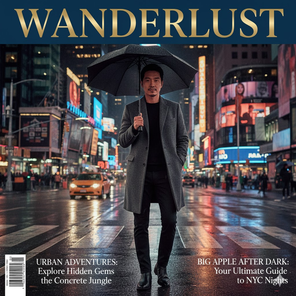 2. 뉴욕의 가을 도시 감성 (미국) Design a high-end, vertical layout Travel Magazine Cover titled 'WANDERLUST' or 'GLOBETROTTER' in bold, luxury serif typography placed at the very top header. Feature a photorealistic, editorial-style portrait of the subject centered in [New York Times Square rainy street at night]. CRITICAL: Automatically style the subject in a fashionable outfit that perfectly matches the local climate, season, and cultural vibe of the location. COMPOSITION: Use a vertical portrait orientation with negative space at the top for the title and at the bottom for text. Include catchy travel headlines, subtext, and a barcode at the bottom corners. LIGHTING: Golden hour or cinematic lighting, 8k resolution, highly detailed. NEGATIVE: horizontal layout, landscape orientation, wide angle, mismatched clothes, distorted text, messy typography, blurry, low resolution, bad blending.