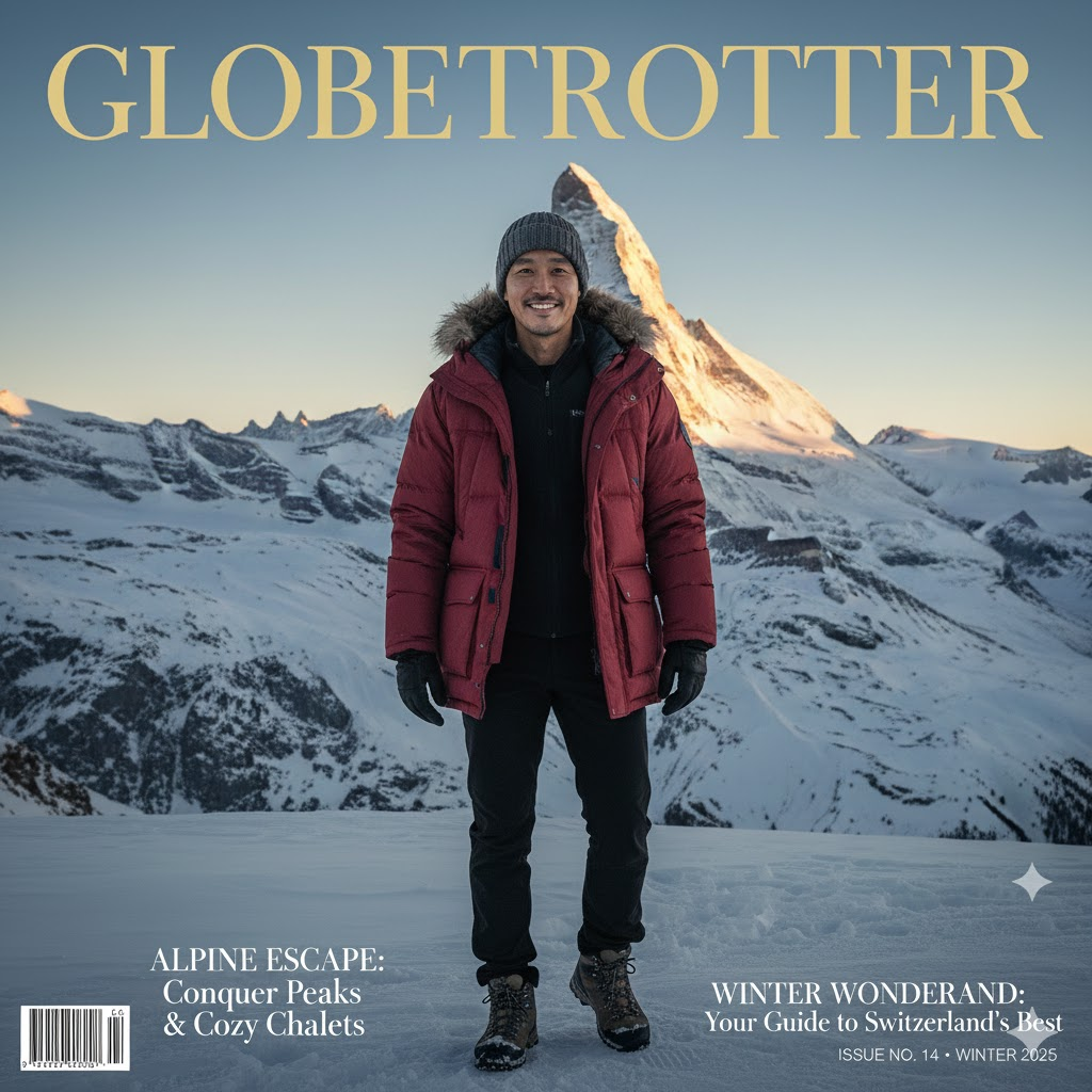 3. 스위스 알프스의 겨울 (스위스) Design a high-end, vertical layout Travel Magazine Cover titled 'WANDERLUST' or 'GLOBETROTTER' in bold, luxury serif typography placed at the very top header. Feature a photorealistic, editorial-style portrait of the subject centered in [Swiss Alps Zermatt snowy mountain peak]. CRITICAL: Automatically style the subject in a fashionable outfit that perfectly matches the local climate, season, and cultural vibe of the location. COMPOSITION: Use a vertical portrait orientation with negative space at the top for the title and at the bottom for text. Include catchy travel headlines, subtext, and a barcode at the bottom corners. LIGHTING: Golden hour or cinematic lighting, 8k resolution, highly detailed. NEGATIVE: horizontal layout, landscape orientation, wide angle, mismatched clothes, distorted text, messy typography, blurry, low resolution, bad blending.