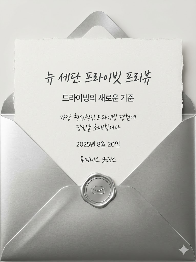 The full-bleed edge-to-edge digital graphic card illustration. No borders, no margins, no external background. A clean, textured white piece of fine stationery is partially pulled out of a 메탈릭 실버 elegant envelope. A matching wax seal with a minimalist emblem is placed at the bottom center of the envelope's flap. The typography is a sophisticated blend of cursive script and clean sans-serif fonts, clearly arranging the text: "뉴 세단 프라이빗 프리뷰", "드라이빙의 새로운 기준", "가장 혁신적인 드라이빙 경험에 당신을 초대합니다", "2025년 8월 20일", and "루미너스 모터스". The overall aesthetic is luxurious, formal, and visually balanced with high-resolution studio lighting. --ar 3:4