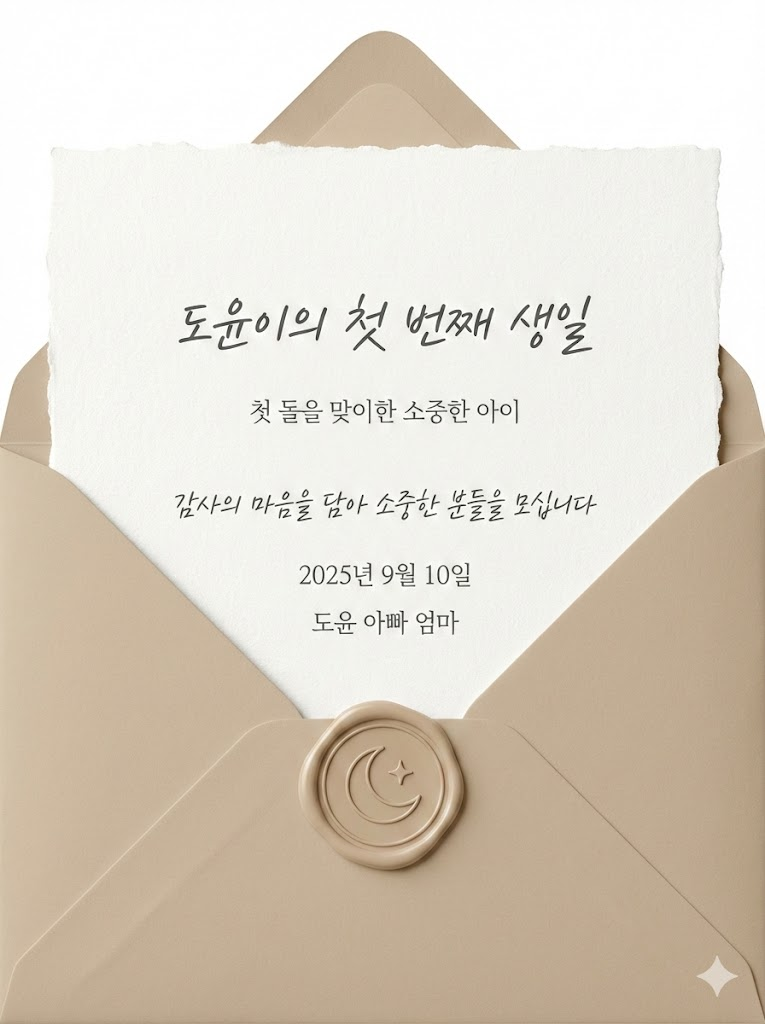 The full-bleed edge-to-edge digital graphic card illustration. No borders, no margins, no external background. A clean, textured white piece of fine stationery is partially pulled out of a 따뜻한 베이지 elegant envelope. A matching wax seal with a minimalist emblem is placed at the bottom center of the envelope's flap. The typography is a sophisticated blend of cursive script and clean sans-serif fonts, clearly arranging the text: "도윤이의 첫 번째 생일", "첫 돌을 맞이한 소중한 아이", "감사의 마음을 담아 소중한 분들을 모십니다", "2025년 9월 10일", and "도윤 아빠 엄마". The overall aesthetic is luxurious, formal, and visually balanced with high-resolution studio lighting. --ar 3:4