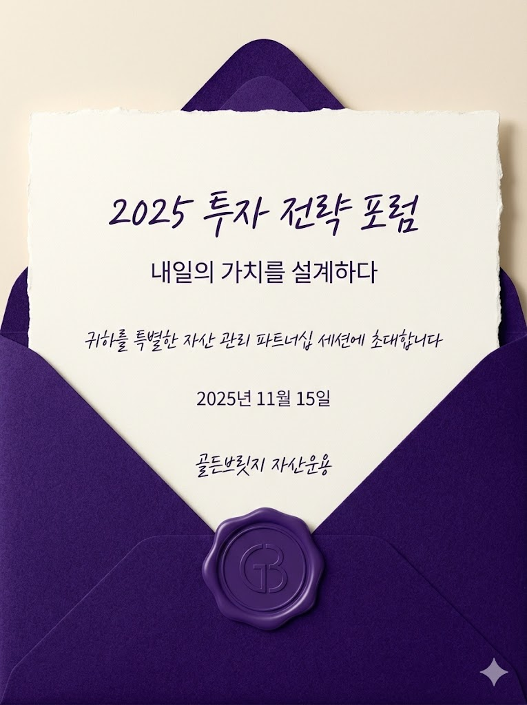 The full-bleed edge-to-edge digital graphic card illustration. No borders, no margins, no external background. A clean, textured white piece of fine stationery is partially pulled out of a 로얄 퍼플 elegant envelope. A matching wax seal with a minimalist emblem is placed at the bottom center of the envelope's flap. The typography is a sophisticated blend of cursive script and clean sans-serif fonts, clearly arranging the text: "2025 투자 전략 포럼", "내일의 가치를 설계하다", "귀하를 특별한 자산 관리 파트너십 세션에 초대합니다", "2025년 11월 15일", and "골든브릿지 자산운용". The overall aesthetic is luxurious, formal, and visually balanced with high-resolution studio lighting. --ar 3:4