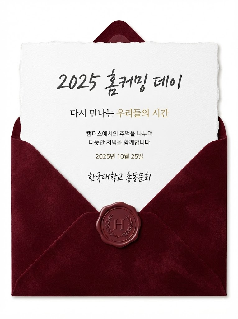The full-bleed edge-to-edge digital graphic card illustration. No borders, no margins, no external background. A clean, textured white piece of fine stationery is partially pulled out of a 클래식 버건디 elegant envelope. A matching wax seal with a minimalist emblem is placed at the bottom center of the envelope's flap. The typography is a sophisticated blend of cursive script and clean sans-serif fonts, clearly arranging the text: "2025 홈커밍 데이", "다시 만나는 우리들의 시간", "캠퍼스에서의 추억을 나누며 따뜻한 저녁을 함께합니다", "2025년 10월 25일", and "한국대학교 총동문회". The overall aesthetic is luxurious, formal, and visually balanced with high-resolution studio lighting. --ar 3:4