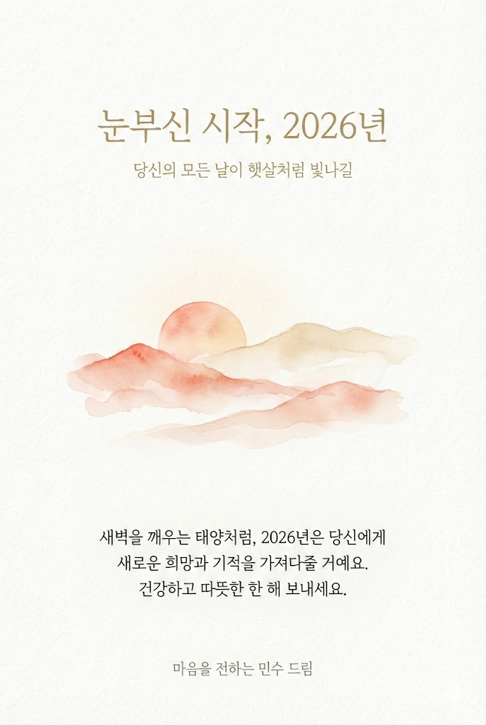- Message Body: In the lower center, include a heartfelt 2-4 line message in a neat, legible hand-drawn font: "새벽을 깨우는 태양처럼, 2026년은 당신에게 새로운 희망과 기적을 가져다줄 거예요. 건강하고 따뜻한 한 해 보내세요.".