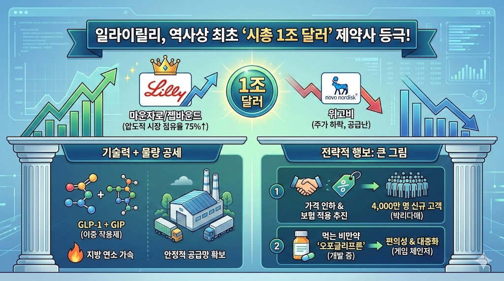 바로 미국의 제약사 '일라이릴리(Eli Lilly)' 이야기입니다. 애플, 마이크로소프트 같은 IT 공룡들이나 갈 수 있다던 **'꿈의 시가총액 1조 달러'**를 제약 역사상 최초로 돌파했습니다. 📈