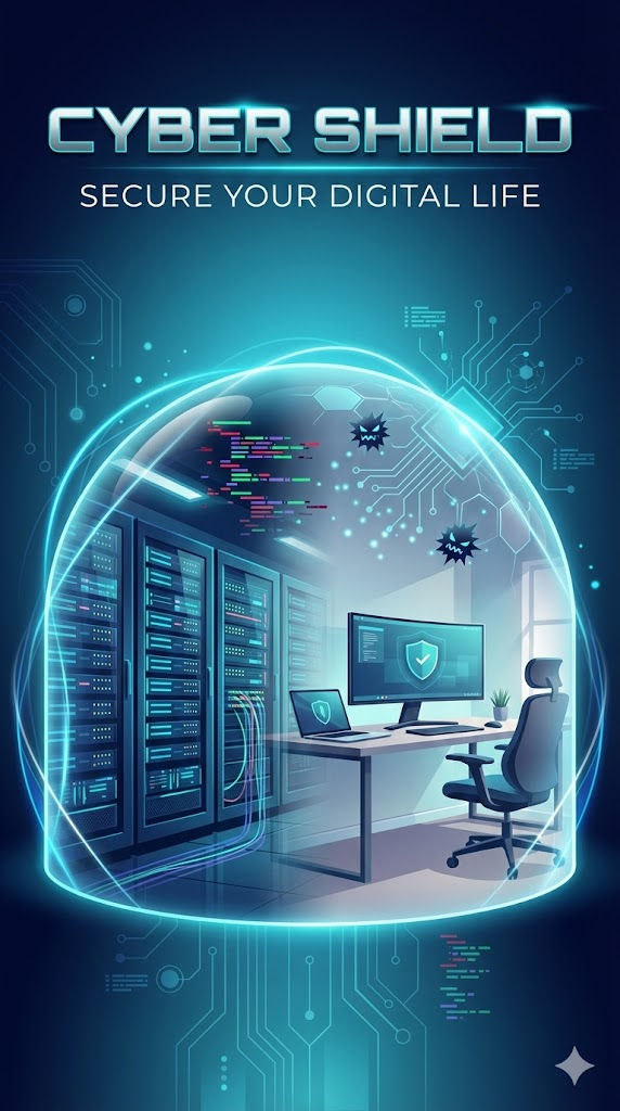 2. 사이버 보안 솔루션 (Cyber Security) Design a high-end 9:16 portrait social media story poster for a Cyber Security Solution targeting a general audience. The central visual is a masterful composite, seamlessly blending a high-tech server room with a calm home office setup, awash in soft, diffused ambient light. A subtle, transparent, shimmering 'protective aura' gently envelops these interiors, radiating a glow that symbolizes impenetrable digital safety. Abstract shapes representing glitchy code and malware are elegantly dissipating into faint light or geometric patterns. Art style: Modern, clean vector illustration with subtle gradients and depth. Color palette: Deep Navy, Neon Cyan, and Metallic Silver to convey intelligence and strength. Dominant typography features the title "Cyber Shield" and tagline "Secure Your Digital Life". Geometric background motifs emphasize precision. --ar 9:16 --stylize 250 --v 6.1 --no blurry, grainy, distorted text, messy details