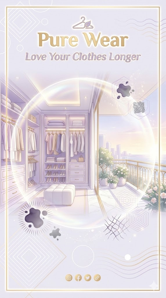 1. 프리미엄 세탁 서비스 (Laundry Service) Design a high-end 9:16 portrait social media story poster for a Premium Laundry Service targeting a general audience. The central visual is a masterful composite, seamlessly blending a luxurious walk-in closet with a bright, airy balcony, awash in soft, diffused ambient light. A subtle, transparent, shimmering 'protective aura' gently envelops these interiors, radiating a glow that symbolizes fabric care and freshness. Abstract shapes representing stains and wrinkles are elegantly dissipating into faint light or geometric patterns. Art style: Modern, clean vector illustration with subtle gradients and depth. Color palette: Pastel Lavender, White, and Soft Gold to convey luxury and purity. Dominant typography features the title "Pure Wear" and tagline "Love Your Clothes Longer". Geometric background motifs emphasize precision. --ar 9:16 --stylize 250 --v 6.1 --no blurry, grainy, distorted text, messy details