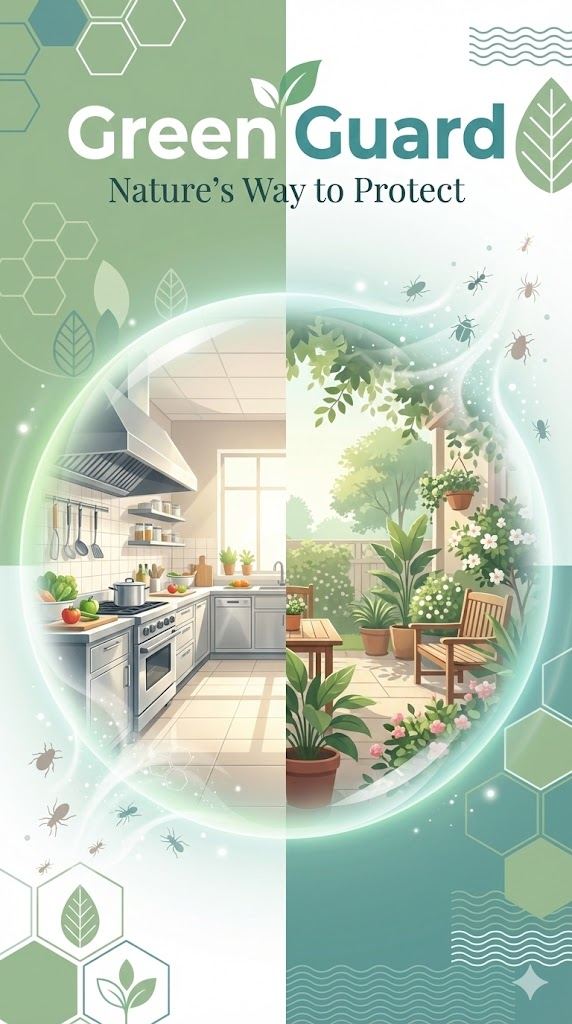 3. 친환경 해충 방제 (Eco-Friendly Pest Control) - Original Concept Refined Design a high-end 9:16 portrait social media story poster for a Eco-Friendly Pest Control targeting a general audience. The central visual is a masterful composite, seamlessly blending a clean commercial kitchen with a peaceful garden patio, awash in soft, diffused ambient light. A subtle, transparent, shimmering 'protective aura' gently envelops these interiors, radiating a glow that symbolizes lasting hygiene and nature harmony. Abstract shapes representing crawling insects are elegantly dissipating into faint light or geometric patterns. Art style: Modern, clean vector illustration with subtle gradients and depth. Color palette: Fresh Sage Green, Teal, and Crisp White to convey cleanliness and organic safety. Dominant typography features the title "Green Guard" and tagline "Nature's Way to Protect". Geometric background motifs emphasize precision. --ar 9:16 --stylize 250 --v 6.1 --no blurry, grainy, distorted text, messy details