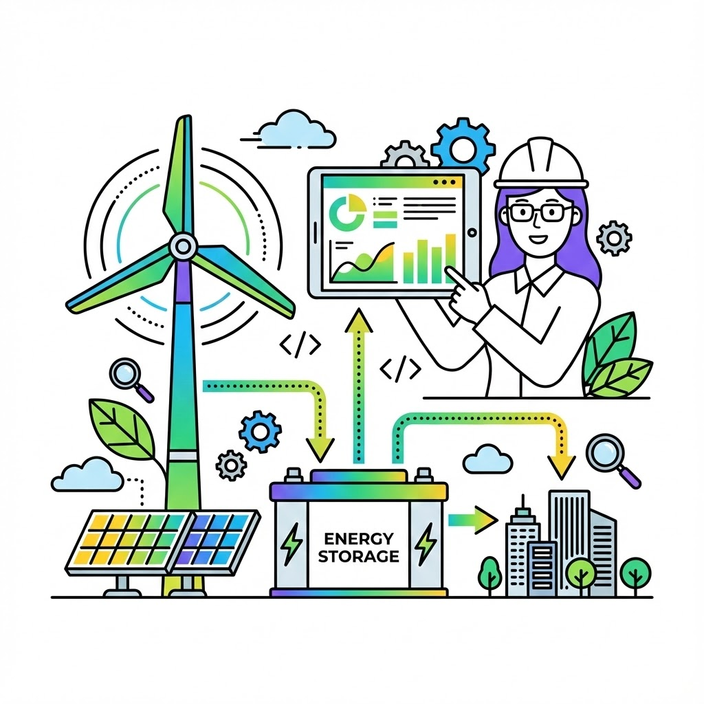 A modern, flat line art illustration with pop color accents, depicting [an engineer pointing at a tablet showing data charts, standing next to a stylized wind turbine and solar panels. Arrows indicate energy flowing from these sources into a battery storage unit and then to a city skyline icon. Leaves and eco-friendly symbols are integrated into the design. The primary colors are greens and yellows.]. The style is clean and minimalist, using black outlines and a limited palette of bright blues, greens, purples, yellows, and oranges for fills and highlights. The composition includes geometric shapes, dotted lines, arrows, and technology icons (like gears, clouds, magnifying glasses, code brackets, charts, etc.) integrated into the scene. The characters are stylized and friendly. The background is plain white or a very light solid color. The overall feel is technological, professional, and engaging. Aspect Ratio: 1:1
