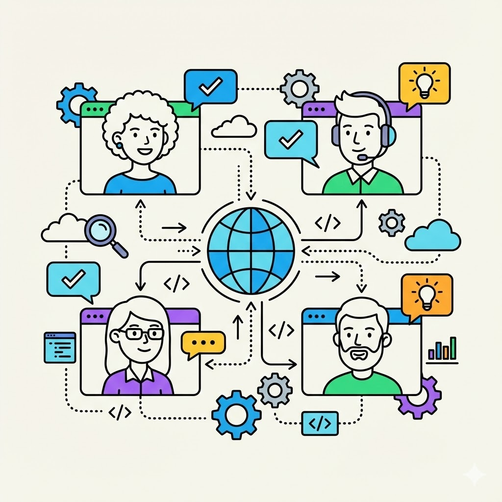 A modern, flat line art illustration with pop color accents, depicting [a diverse team of four people participating in a video conference call, each on a separate screen within a larger virtual meeting interface. Lines and arrows connect their screens across a stylized globe icon, indicating global collaboration. Speech bubbles with checkmarks and lightbulbs float around them.]. The style is clean and minimalist, using black outlines and a limited palette of bright blues, greens, purples, yellows, and oranges for fills and highlights. The composition includes geometric shapes, dotted lines, arrows, and technology icons (like gears, clouds, magnifying glasses, code brackets, charts, etc.) integrated into the scene. The characters are stylized and friendly. The background is plain white or a very light solid color. The overall feel is technological, professional, and engaging. Aspect Ratio: 1:1