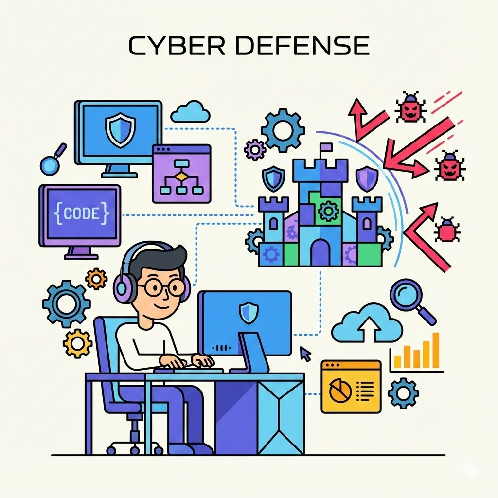 A modern, flat line art illustration with pop color accents, depicting [a cybersecurity expert sitting at a desk with multiple monitors showing shield icons and code, defending a stylized network fortress from stylized digital threats represented by red arrows and bugs. The expert is wearing headphones and actively typing. The color palette focuses on blues and purples for defense and touches of red for threats.]. The style is clean and minimalist, using black outlines and a limited palette of bright blues, greens, purples, yellows, and oranges for fills and highlights. The composition includes geometric shapes, dotted lines, arrows, and technology icons (like gears, clouds, magnifying glasses, code brackets, charts, etc.) integrated into the scene. The characters are stylized and friendly. The background is plain white or a very light solid color. The overall feel is technological, professional, and engaging. Aspect Ratio: 1:1
