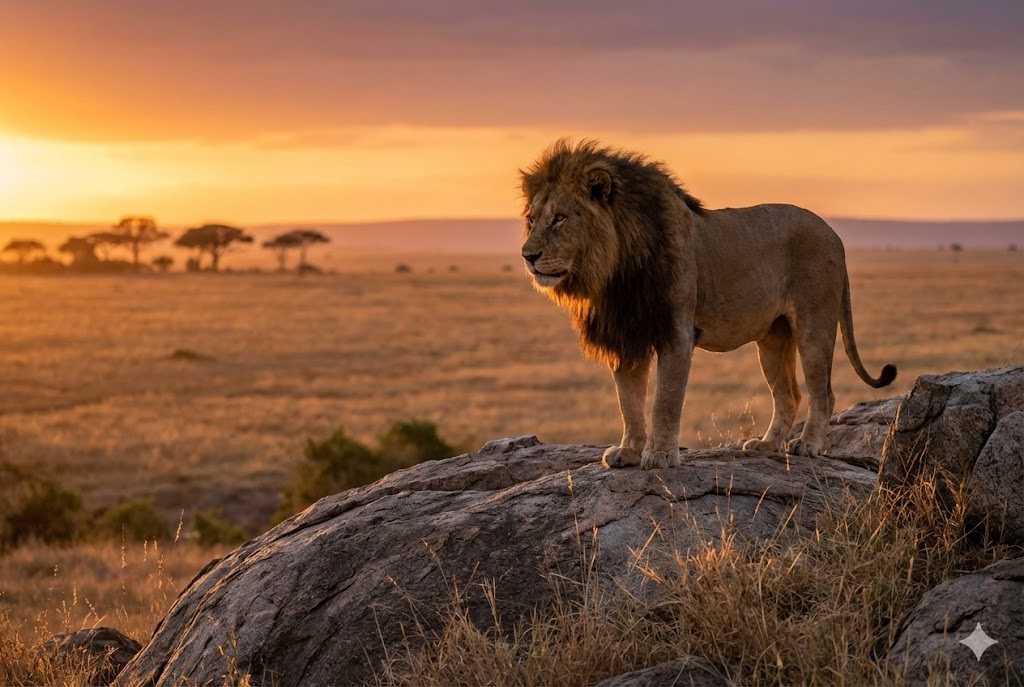 A photorealistic wide shot of a majestic male lion with a thick mane, standing proudly on a rock outcrop, set in the vast golden plains of the Serengeti. The scene is illuminated by the soft, warm glow of a setting sun (golden hour), creating a powerful and heroic atmosphere. Captured with a Nikon Z9, 400mm telephoto lens, emphasizing the individual strands of the mane and the vast horizon. The image should be in a 3:2 format.