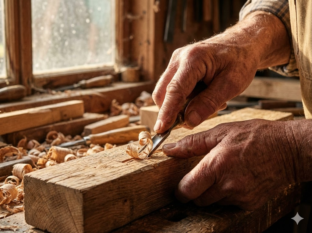 A photorealistic extreme close-up of an elderly carpenter's weathered hands, carefully carving a piece of oak wood, set in a rustic sunlit workshop filled with wood shavings. The scene is illuminated by warm afternoon sunlight streaming through a dusty window, creating a peaceful and nostalgic atmosphere. Captured with a Canon EOS R5, 100mm macro lens, emphasizing the deep wrinkles on the skin and the intricate wood grain. The image should be in a 4:3 format.
