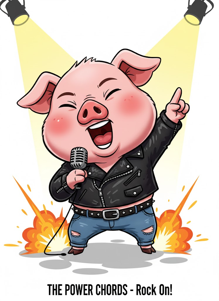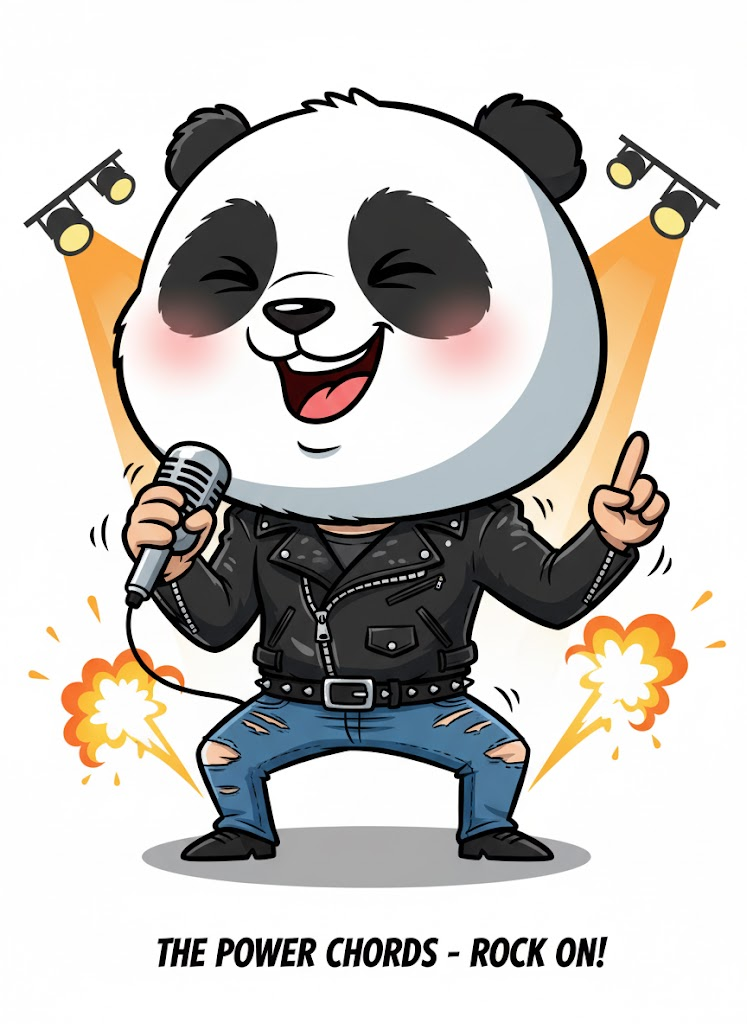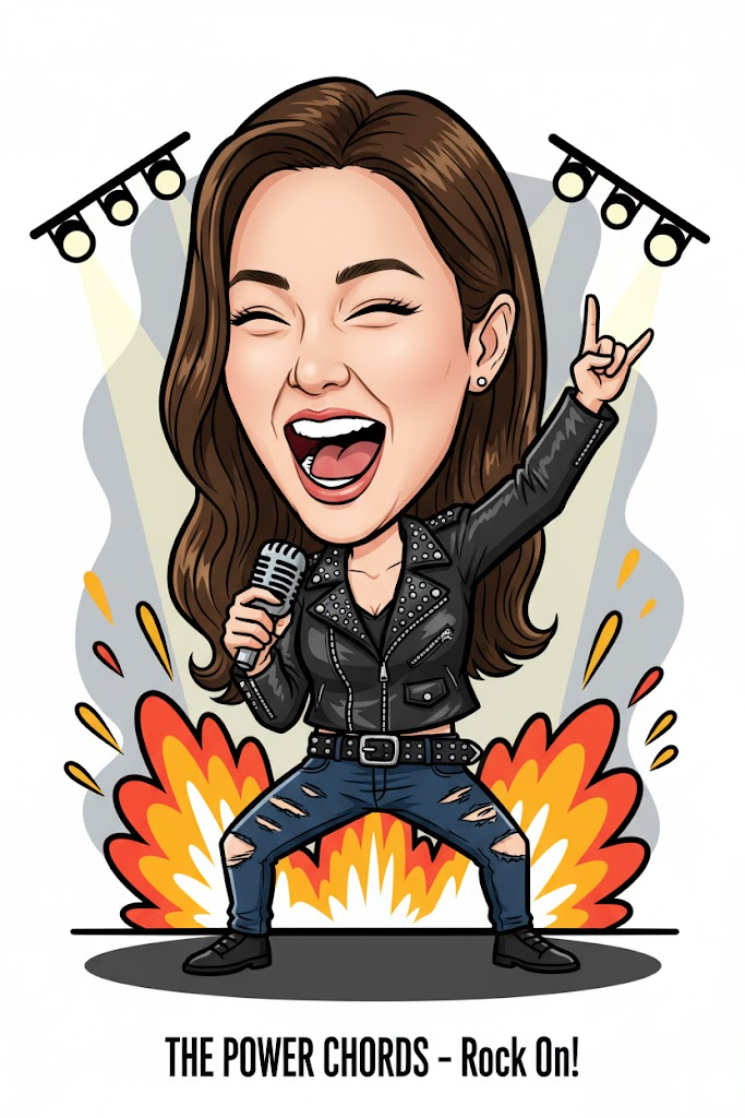 "Generate a thick line vector caricature with a big head and small body while keeping the same facial character as the uploaded photo. Show the person energetically rocking out with a microphone in hand, eyes closed in passion, wearing a leather jacket, ripped jeans, and a studded belt. Place him standing on a concert stage with spotlights and pyrotechnics in the background. Use a white background with an abstract shadow effect, soft shadows, and thick lines to strengthen the look. Keep the lighting soft and add the signature THE POWER CHORDS - Rock On! at the bottom center."