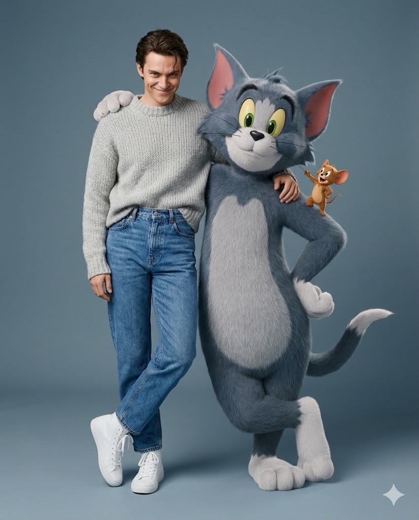 Hyper-realistic professional studio fashion photoshoot of a person wearing a light grey knitted sweater, blue high-waisted jeans, and white high-top sneakers. The person is standing with a mischievous expression and an arm around a giant, photorealistic 3D render of Tom, while a small 3D Jerry playfully sits on Tom's shoulder. The entire scene is set against a clean grey-blue clean, solid studio backdrop color with no other props, furniture, or distractions, ensuring a minimalist and high-end aesthetic. Professional studio lighting, 8k resolution, cinematic quality, sharp focus on textures, fashion magazine style. --ar 4:5