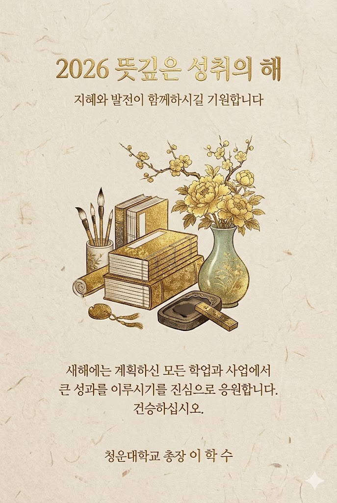 Design a premium and minimalist luxury digital New Year greeting card for 2026 with a high-end brand aesthetic. The image must be a direct, flat view of the card design itself, isolated with absolutely no surrounding background context or environment. Full-bleed edge-to-edge digital graphic card illustration. No borders, no margins, no external background. The overall mood is sophisticated, clean, and opulent, presented on a luxurious textured cardstock. Card Surface & Texture: Card Surface: The card itself is made of textured natural beige Korean Hanji paper. The rich texture of the card is visibly prominent. Header (Embossed Gold Foil): At the top center, place a clean title in embossed gold foil typography: "2026 뜻깊은 성취의 해". Below it, add a small subtitle in gold foil: "지혜와 발전이 함께하시길 기원합니다". Central Illustration (Korean Traditional Geumbunhwa Minhwa Style): Presented in the center is a illustration rendered in the style of Korean traditional folk painting (Minhwa), specifically using gold powder (Geumbunhwa) painting techniques. The subject is a scholarly 'Chaekgeori' still life composition featuring stacked traditional books, brushes, a inkstone, and a vase with flowers, all painted in fine gold dust. This illustration should feel like painted gold dust with rich textures and traditional shading, contrasting with the sharp embossed foil of the text. Message Body (Embossed Gold Foil): In the lower center, include a heartfelt 2-4 line message in elegant gold foil script: "새해에는 계획하신 모든 학업과 사업에서 큰 성과를 이루시기를 진심으로 응원합니다. 건승하십시오.". Footer (Embossed Gold Foil): At the very bottom, add the sender's name in a refined gold foil signature style: "청운대학교 총장 이학수". Style Notes: Flat lay design, isolated card view, minimalist luxury aesthetic, mix of embossed gold foil text and gold powder painting (Geumbunhwa) illustration, clean typography, generous negative space, sophisticated composition. --ar 2:3