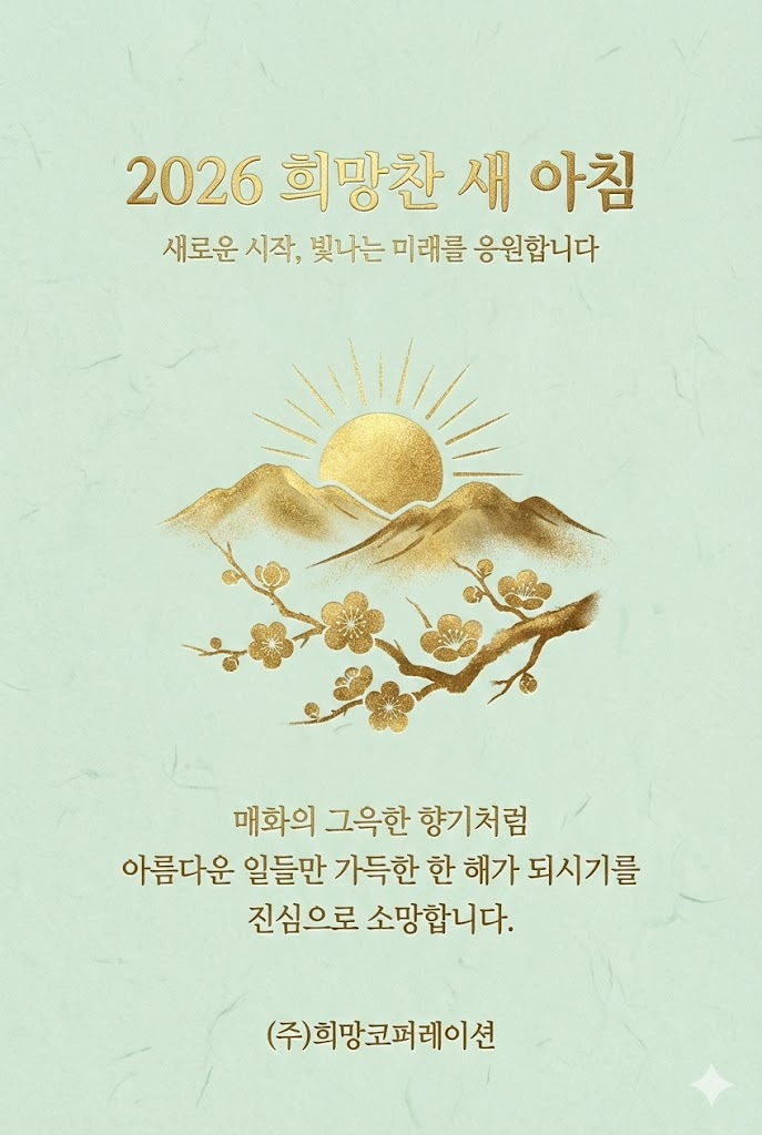 Design a premium and minimalist luxury digital New Year greeting card for 2026 with a high-end brand aesthetic. The image must be a direct, flat view of the card design itself, isolated with absolutely no surrounding background context or environment. Full-bleed edge-to-edge digital graphic card illustration. No borders, no margins, no external background. The overall mood is sophisticated, clean, and opulent, presented on a luxurious textured cardstock. Card Surface & Texture: Card Surface: The card itself is made of soft, pale jade green textured Hanji. The rich texture of the card is visibly prominent. Header (Embossed Gold Foil): At the top center, place a clean title in embossed gold foil typography: "2026 희망찬 새 아침". Below it, add a small subtitle in gold foil: "새로운 시작, 빛나는 미래를 응원합니다". Central Illustration (Korean Traditional Geumbunhwa Minhwa Style): Presented in the center is a illustration rendered in the style of Korean traditional folk painting (Minhwa), specifically using gold powder (Geumbunhwa) painting techniques. The subject is a minimalist gold powder painting of a sun rising over mountains with a branch of blooming plum blossoms in the foreground. This illustration should feel like painted gold dust with rich textures and traditional shading, contrasting with the sharp embossed foil of the text. Message Body (Embossed Gold Foil): In the lower center, include a heartfelt 2-4 line message in elegant gold foil script: "매화의 그윽한 향기처럼 아름다운 일들만 가득한 한 해가 되시기를 진심으로 소망합니다.". Footer (Embossed Gold Foil): At the very bottom, add the sender's name in a refined gold foil signature style: "(주)희망코퍼레이션". Style Notes: Flat lay design, isolated card view, minimalist luxury aesthetic, mix of embossed gold foil text and gold powder painting (Geumbunhwa) illustration, clean typography, generous negative space, sophisticated composition. --ar 2:3