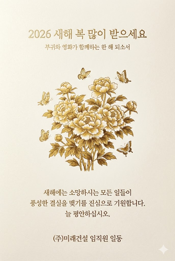 Design a premium and minimalist luxury digital New Year greeting card for 2026 with a high-end brand aesthetic. The image must be a direct, flat view of the card design itself, isolated with absolutely no surrounding background context or environment. Full-bleed edge-to-edge digital graphic card illustration. No borders, no margins, no external background. The overall mood is sophisticated, clean, and opulent, presented on a luxurious textured cardstock. Card Surface & Texture: Card Surface: The card itself is made of shimmering cream-colored pearlescent cardstock. The rich texture of the card is visibly prominent. Header (Embossed Gold Foil): At the top center, place a clean title in embossed gold foil typography: "2026 새해 복 많이 받으세요". Below it, add a small subtitle in gold foil: "부귀와 영화가 함께하는 한 해 되소서". Central Illustration (Korean Traditional Geumbunhwa Minhwa Style): Presented in the center is a illustration rendered in the style of Korean traditional folk painting (Minhwa), specifically using gold powder (Geumbunhwa) painting techniques. The subject is a large, blooming bouquet of peonies (Bugwihwa) with butterflies, painted entirely in radiant gold powder. This illustration should feel like painted gold dust with rich textures and traditional shading, contrasting with the sharp embossed foil of the text. Message Body (Embossed Gold Foil): In the lower center, include a heartfelt 2-4 line message in elegant gold foil script: "새해에는 소망하시는 모든 일들이 풍성한 결실을 맺기를 진심으로 기원합니다. 늘 평안하십시오.". Footer (Embossed Gold Foil): At the very bottom, add the sender's name in a refined gold foil signature style: "(주)미래건설 임직원 일동". Style Notes: Flat lay design, isolated card view, minimalist luxury aesthetic, mix of embossed gold foil text and gold powder painting (Geumbunhwa) illustration, clean typography, generous negative space, sophisticated composition. --ar 2:3