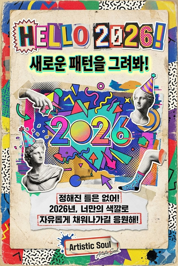 Design a vibrant retro collage poster style digital New Year greeting card for 2026 with a witty, artistic aesthetic reminiscent of 90s design. The image must be a direct, flat view of the card design itself, full-bleed edge-to-edge digital graphic card illustration. No borders, no margins, no external background. The overall mood is bold, eclectic, and fun, featuring a mix of cut-out imagery, halftone patterns, and sticker-like elements on a textured vintage paper surface. Card Surface & Texture (All text must be rendered in bold, eclectic, retro typography, mixing various fonts, distressed stamps, and cut-out letters): Card Surface: The card itself is made of [thick, textured art paper with overlapping geometric patterns in primary colors and black/white squiggles, showing slight wear on edges]. The texture should be highly visible. Header: At the top center, place a bold, prominent title using mixed retro fonts or cut-out letters: "HELLO 2026!". Below it, add a witty subtitle in a contrasting retro style: "새로운 패턴을 그려봐!". Central Illustration: A dynamic retro collage illustration depicted flat on the card. The piece should be [an abstract composition heavily inspired by 90s Memphis design featuring floating geometric shapes, zigzags, dots, and squiggly lines forming a stylized '2026'. Cutout fragments of classical statues wearing party hats are mixed with bold, flat graphical elements. It is composed of cut-out magazine images, halftone prints, abstract shapes, and sticker-like elements with white borders]. The composition should be witty, artistic, and layered. Message Body: In the lower center, include a 2-4 line message using distressed, stamped-style text or label maker font: "정해진 틀은 없어! 2026년, 너만의 색깔로 자유롭게 채워나가길 응원해!". Footer: At the very bottom, add the sender's name or brand name in a unique sticker or stamped signature style: "Artistic Soul". Style Notes: Flat lay design, isolated card view, retro collage, vintage poster, 90s color palette, halftone textures, distressed paper, bold typography, sticker art aesthetic, witty composition. Aspect Ratio: --ar 2:3